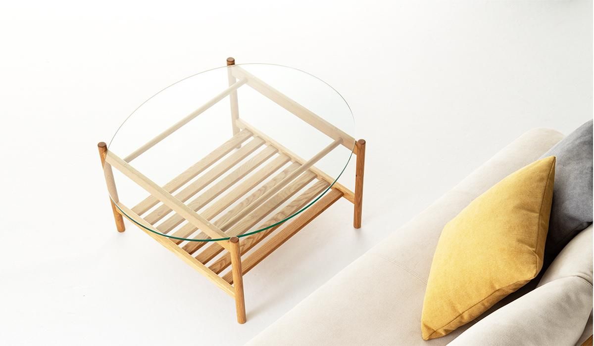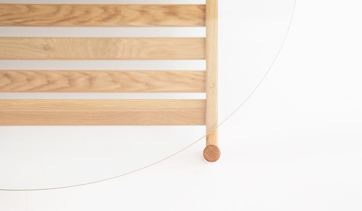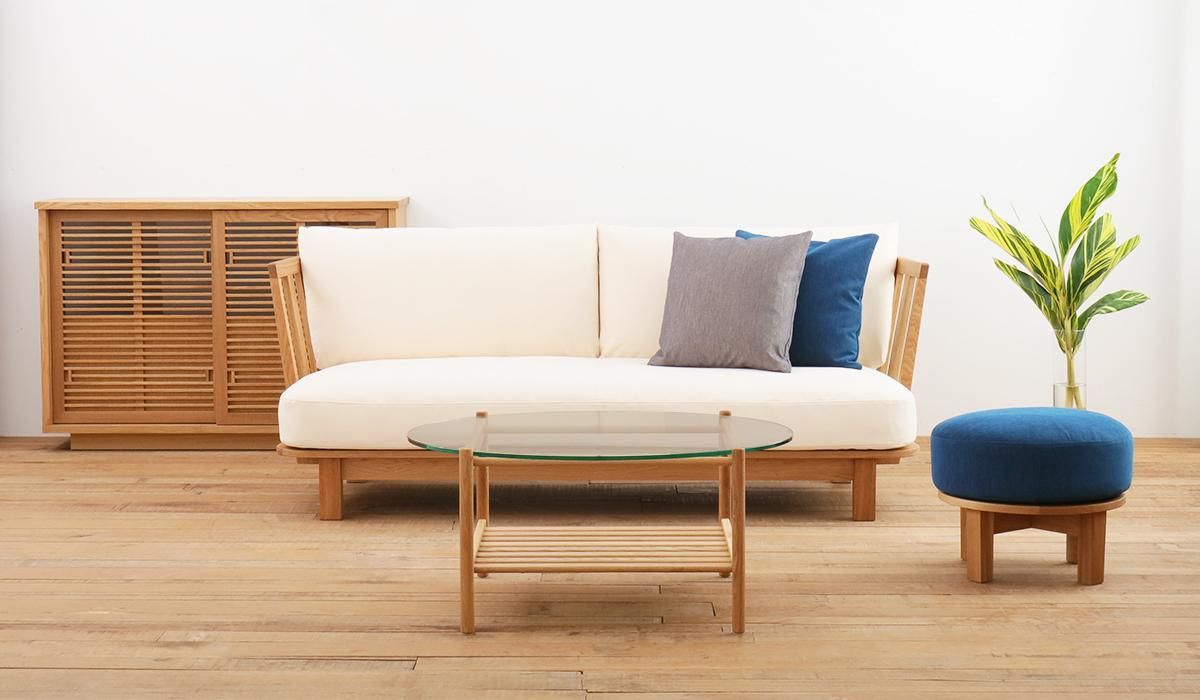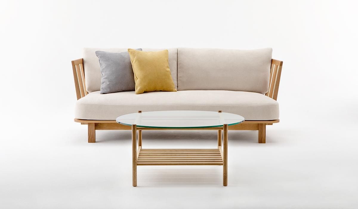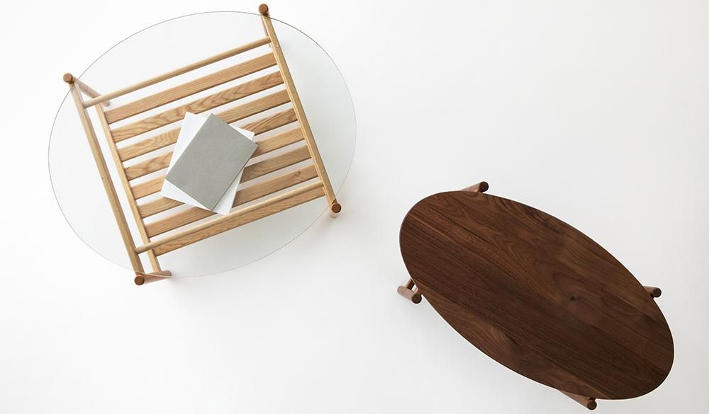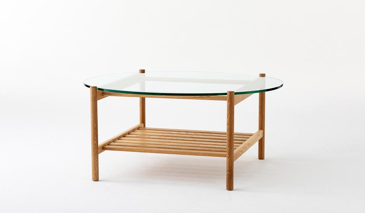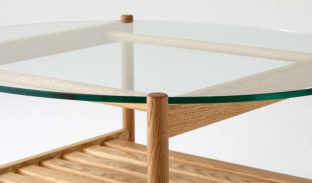 無垢格子の美しさと、丸い天板の組み合わせがモダンなリビングテーブルです。奥行きはD450とD750の2タイプをご用意。天板は、ガラスと無垢材からお選びいただけます。